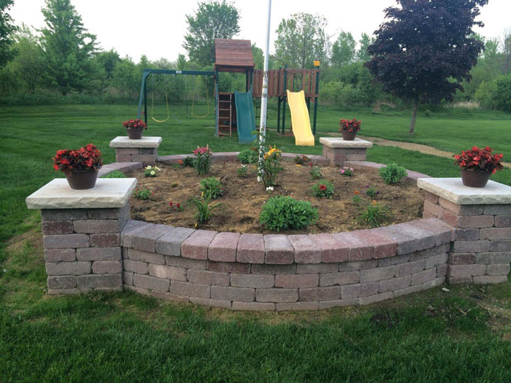 We built this beautiful retaining wall planter box in Northville, MI. Our clients were interested in creating a nice focal point in their backyard around their flag pole. So we got to designing and this is what we came up with. Retaining walls can be used for many purposes as you can see. For this project, instead of building a retaining wall to control soil erosion, or level out an area and retain higher ground, we built this retaining wall for pure aesthetics. If you live in the Northville or Plymouth area and are in need of a retaining wall, please give us a call today for a free design and consultation!